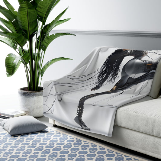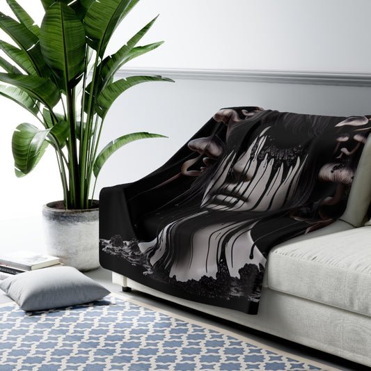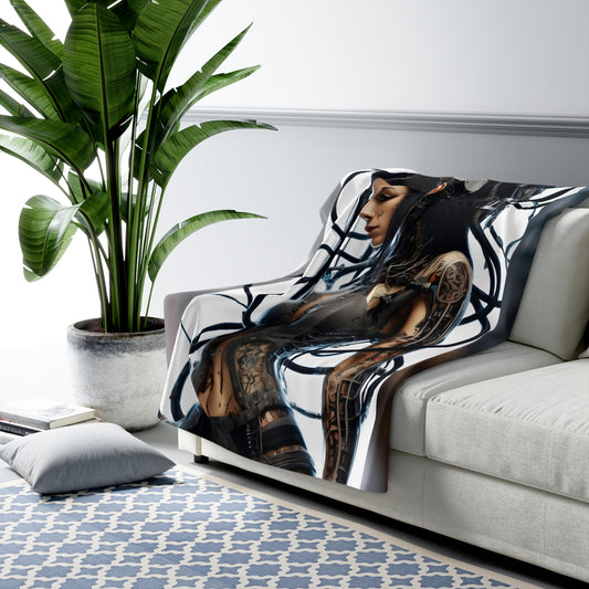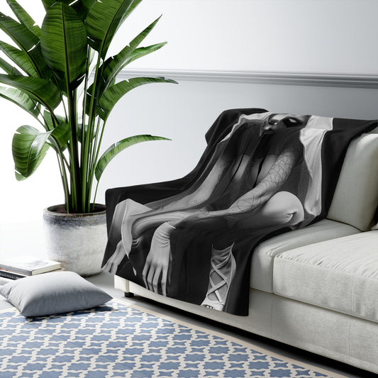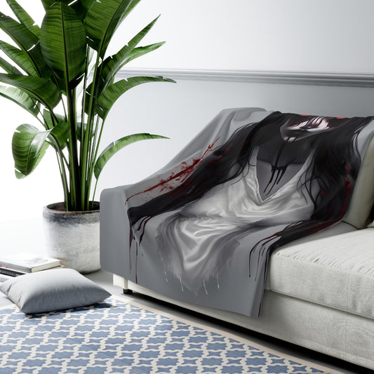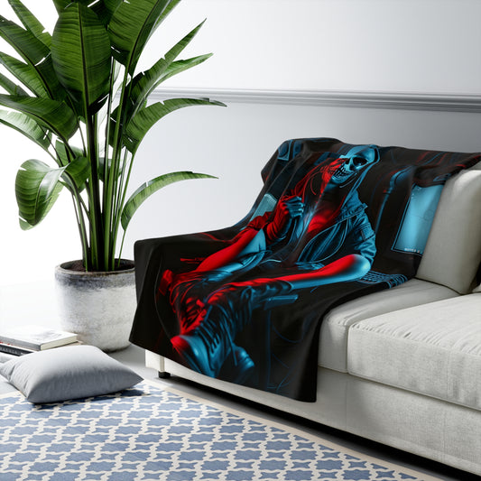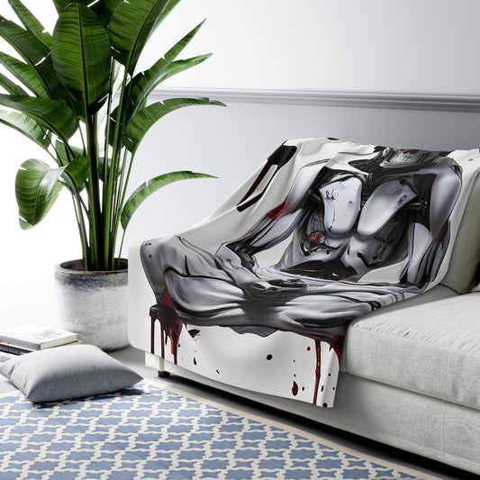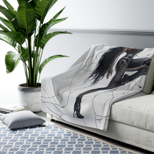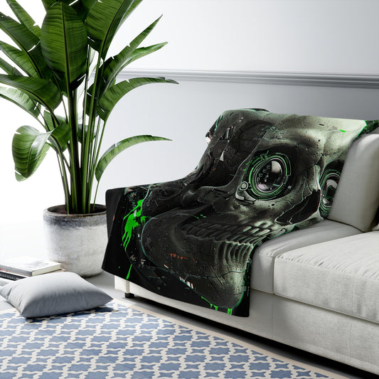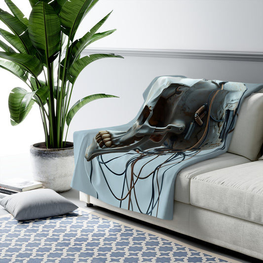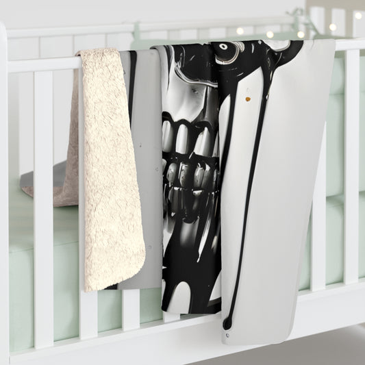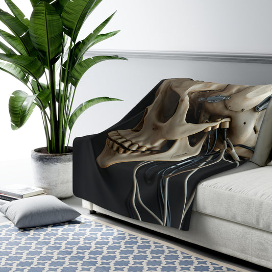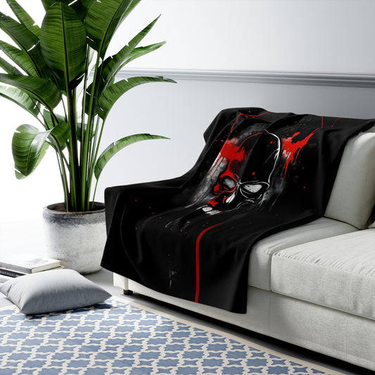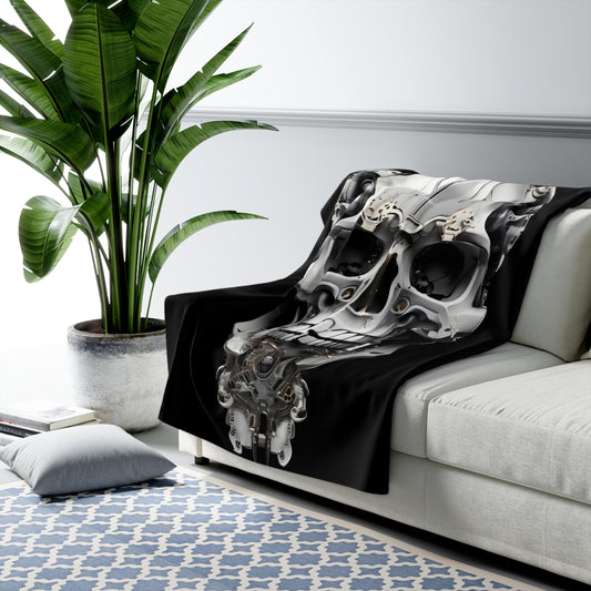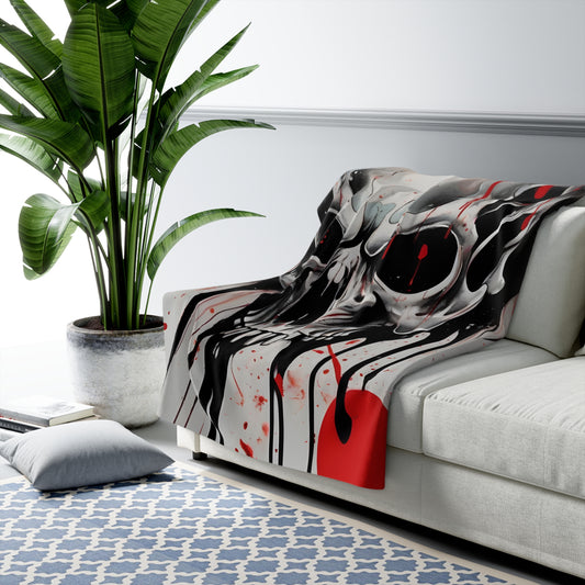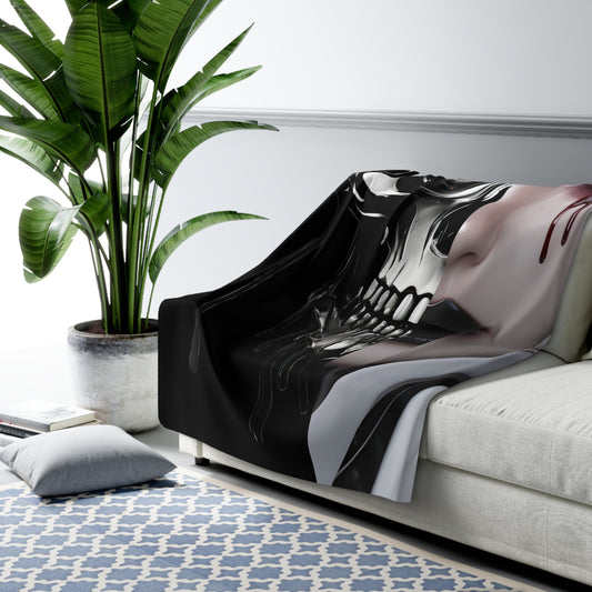 Skull blanket draped organically on a black sofa in an industrial modern loft living room. Features include exposed brick walls, black steel window frames, concrete floors, a striking modern chandelier, and ample natural light from large windows.