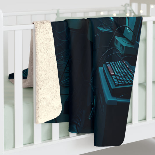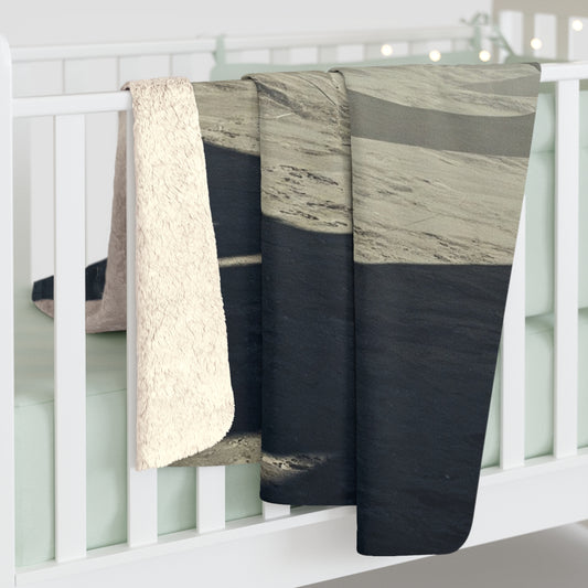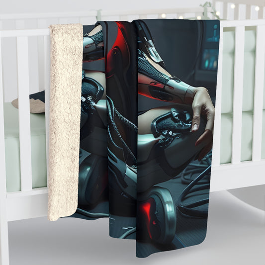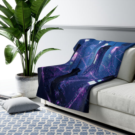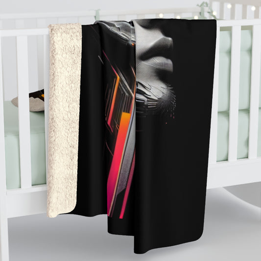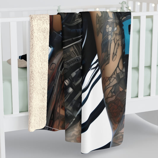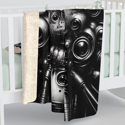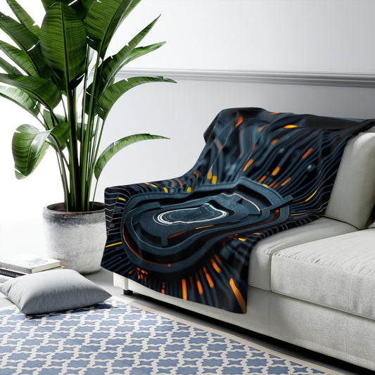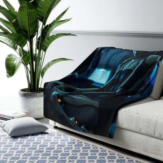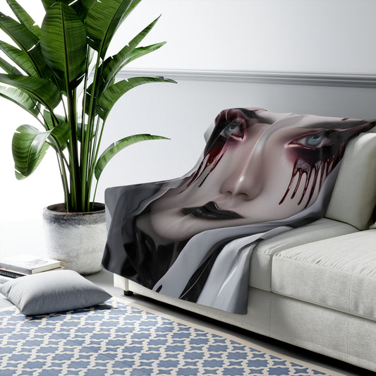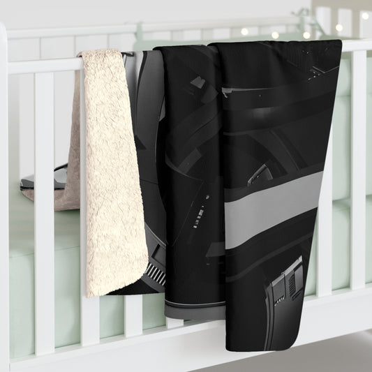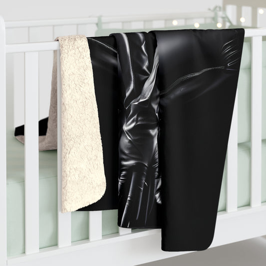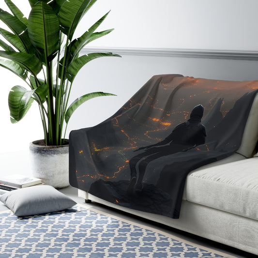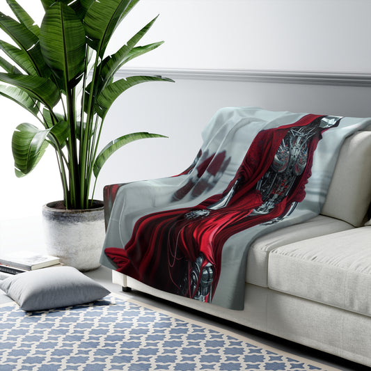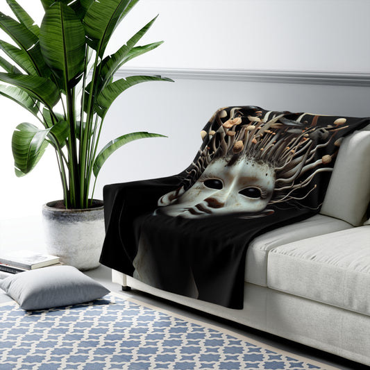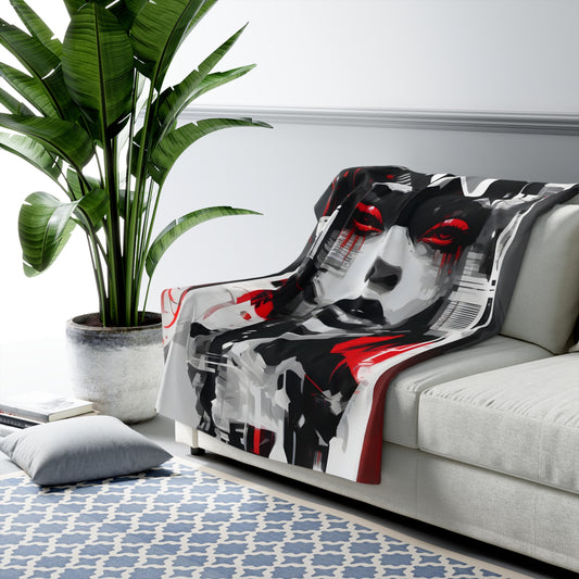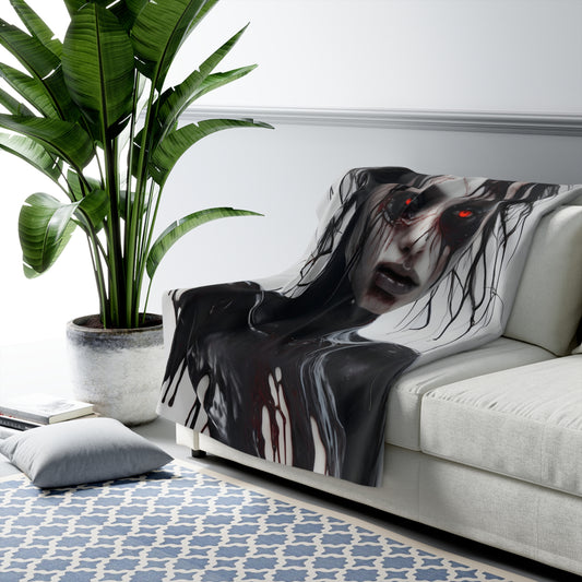 Skull blanket draped organically on a black sofa in an industrial modern loft living room. Features include exposed brick walls, black steel window frames, concrete floors, a striking modern chandelier, and ample natural light from large windows.