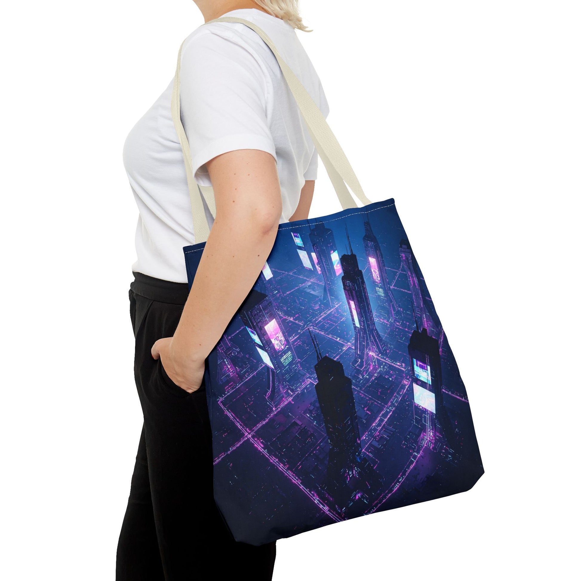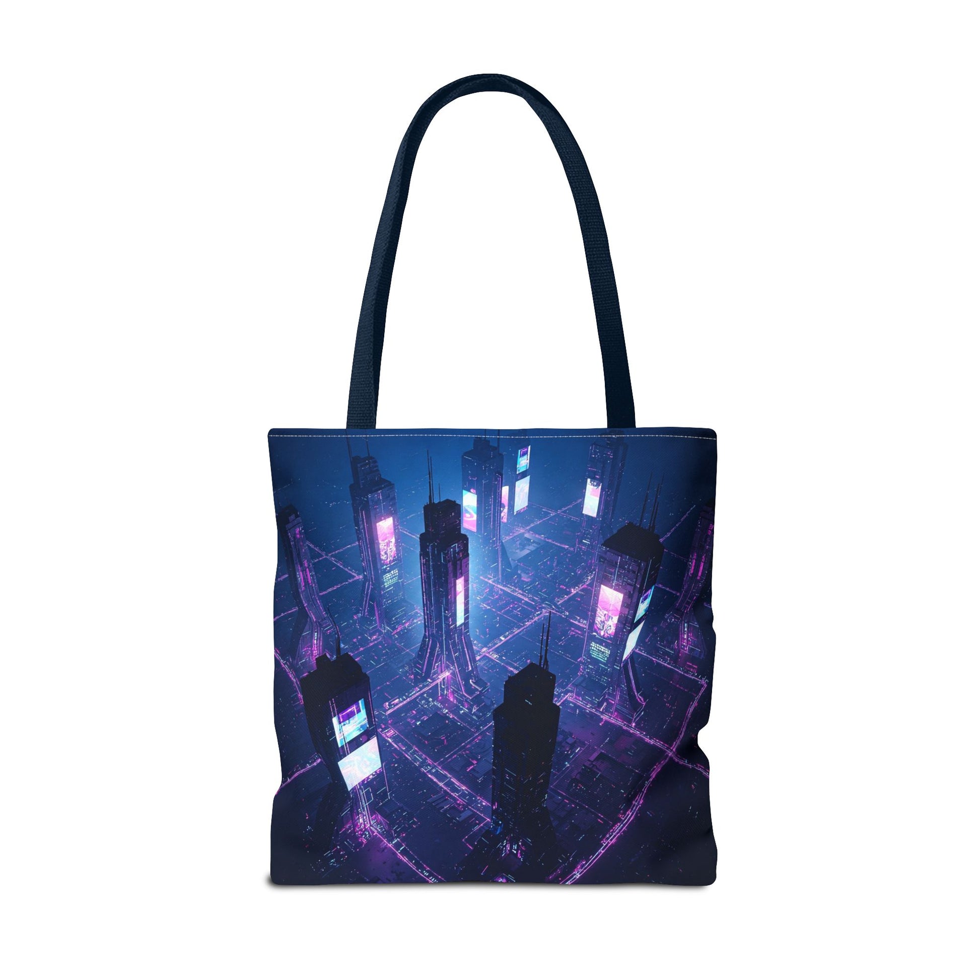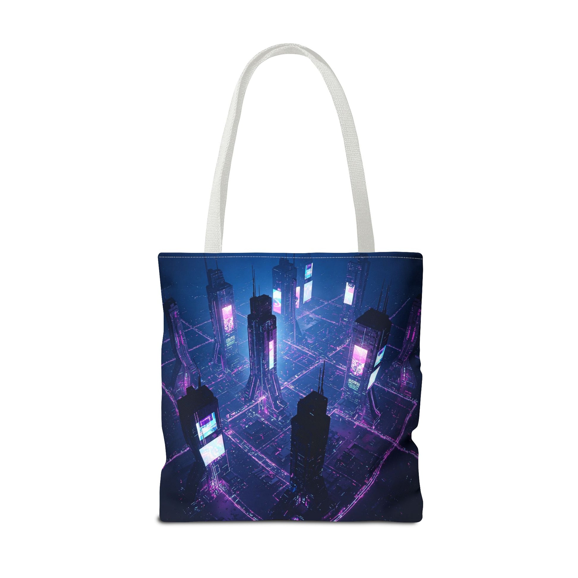 Introducing a vibrant Tote Bag, perfect for adding a pop of personality to your everyday errands or beach trips. This bag offers a stylish yet sturdy solution for carrying your essentials while making a statement. With its captivating design that evokes a futuristic cityscape, this tote is not just a bag; it's a conversation starter. Ideal for trendsetters and art enthusiasts alike, it's also great for gifting during holidays, birthdays, or as a special treat for yourself. Celebrate creativity and functionality with this versatile accessory, perfect for sunny days, shopping adventures, or casual outings.