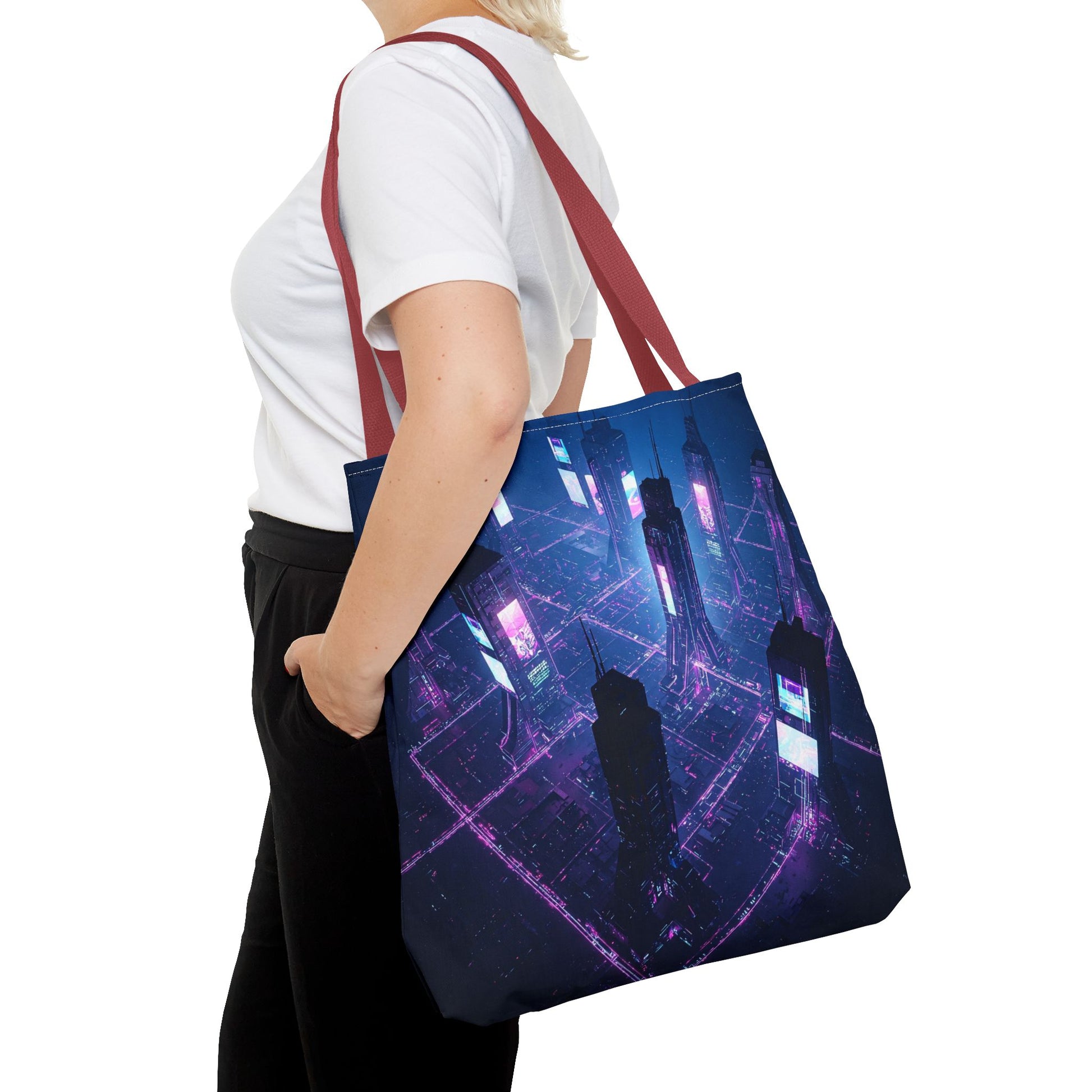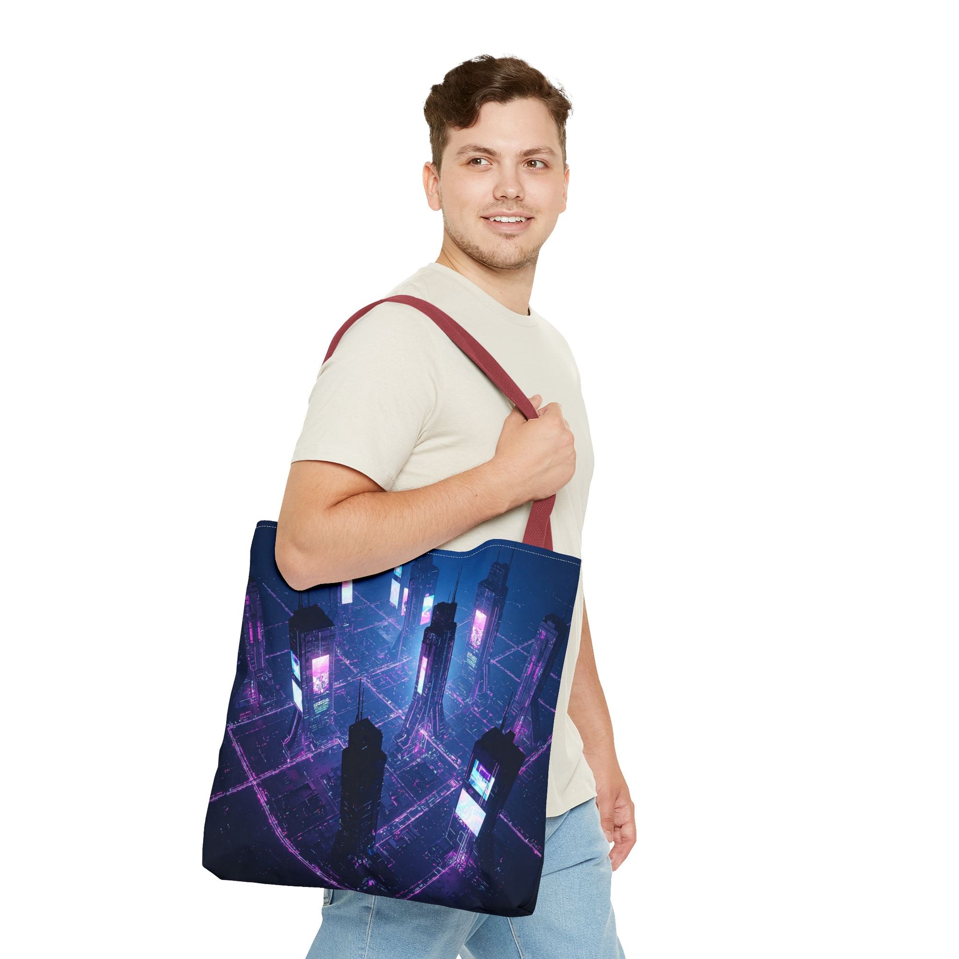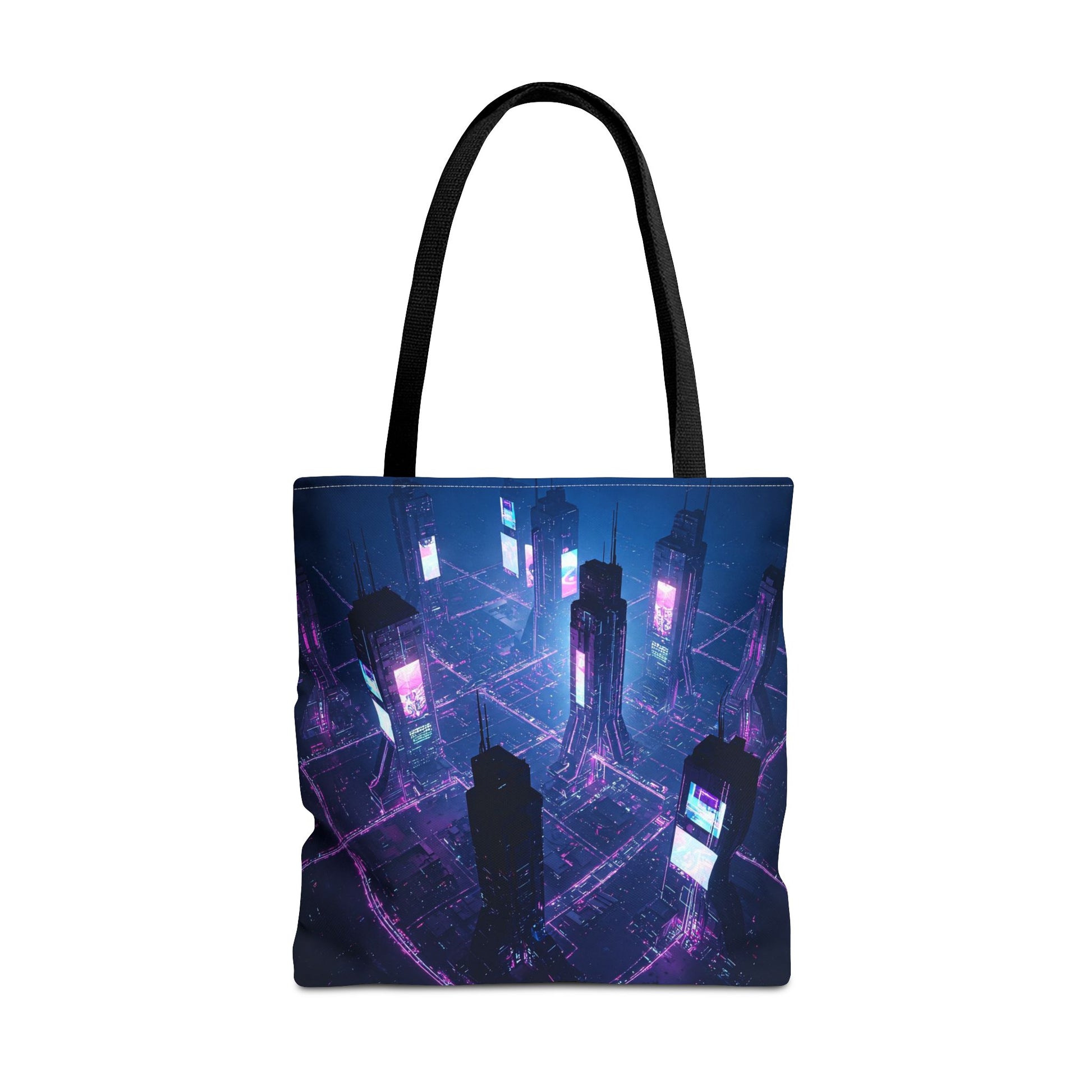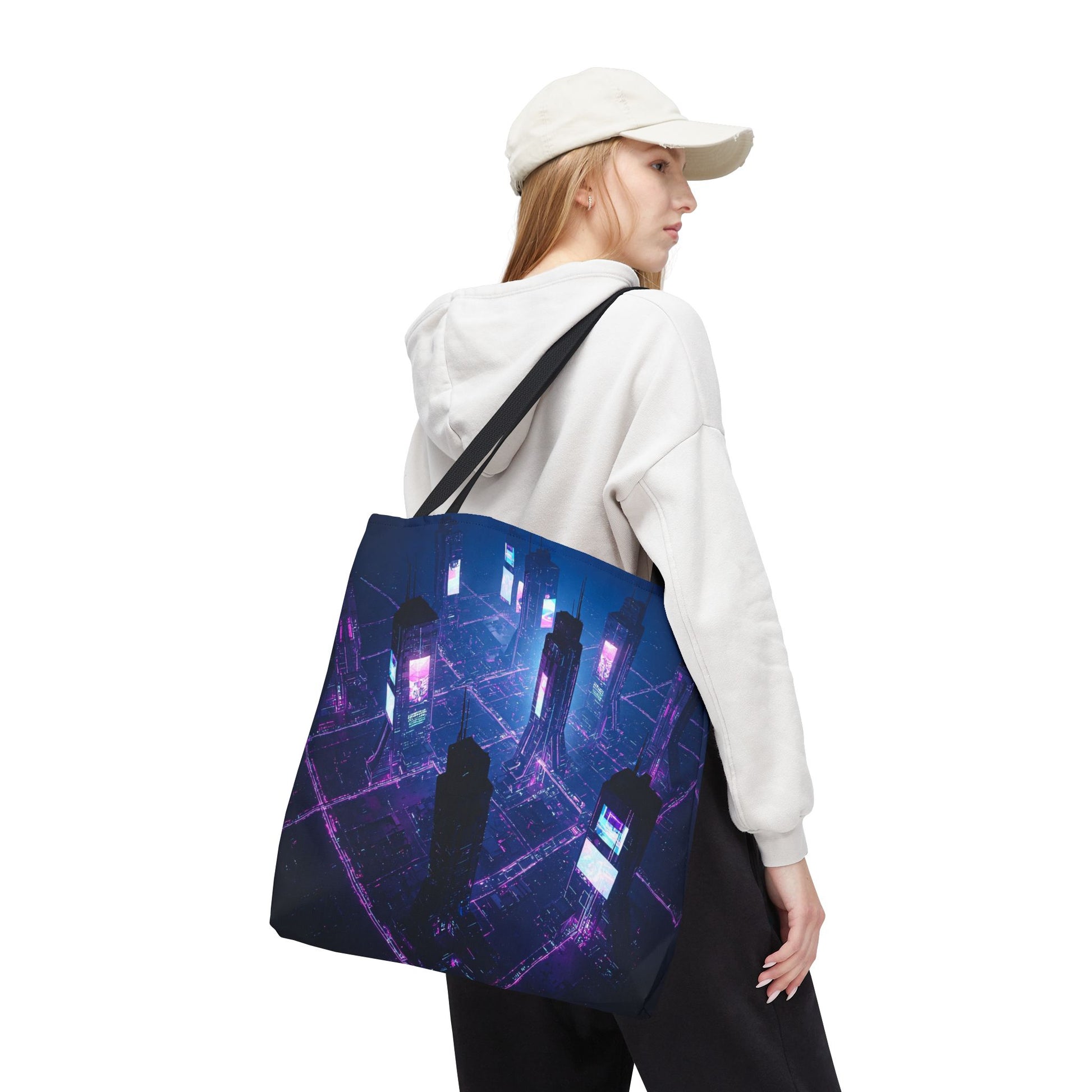 Introducing a vibrant Tote Bag, perfect for adding a pop of personality to your everyday errands or beach trips. This bag offers a stylish yet sturdy solution for carrying your essentials while making a statement. With its captivating design that evokes a futuristic cityscape, this tote is not just a bag; it's a conversation starter. Ideal for trendsetters and art enthusiasts alike, it's also great for gifting during holidays, birthdays, or as a special treat for yourself. Celebrate creativity and functionality with this versatile accessory, perfect for sunny days, shopping adventures, or casual outings.