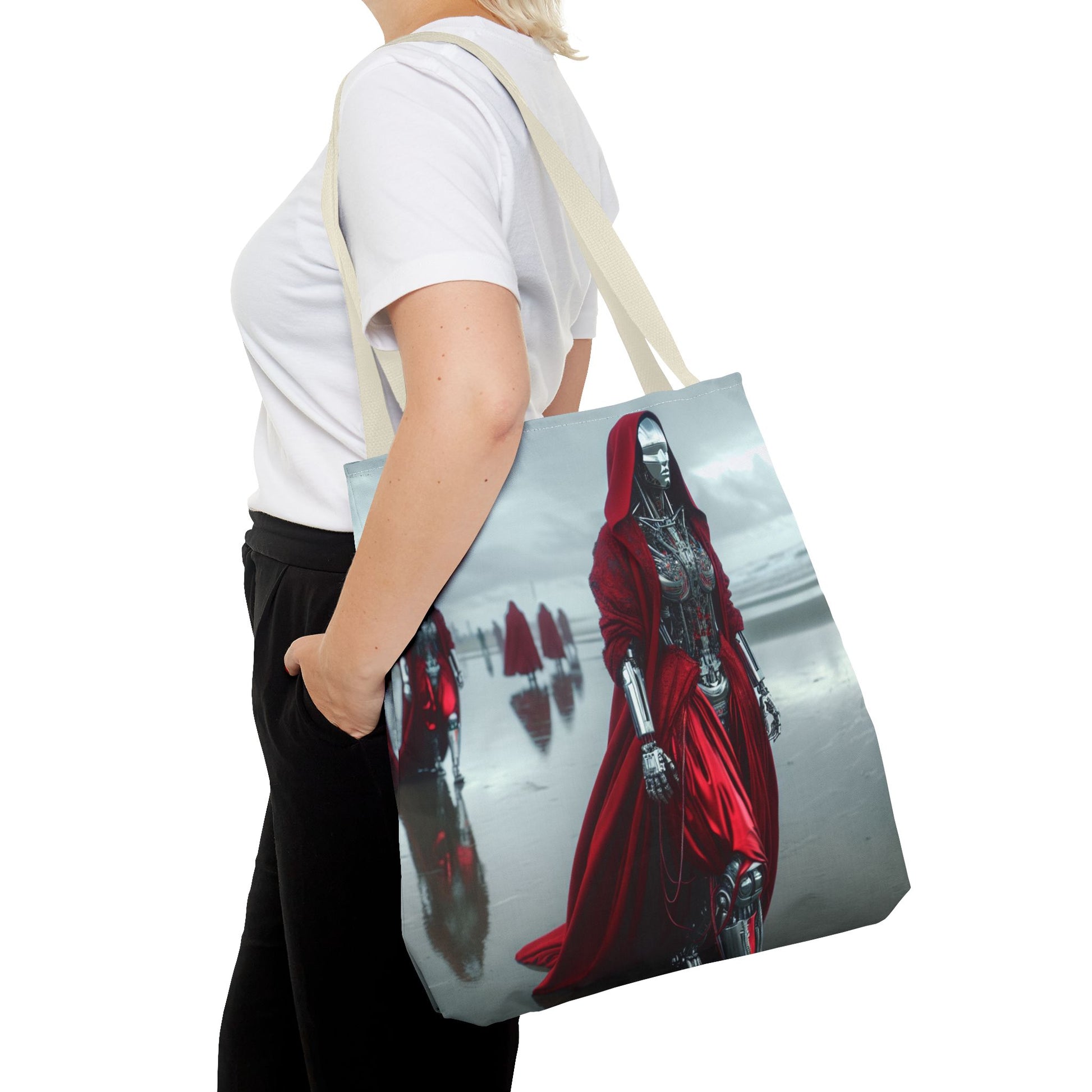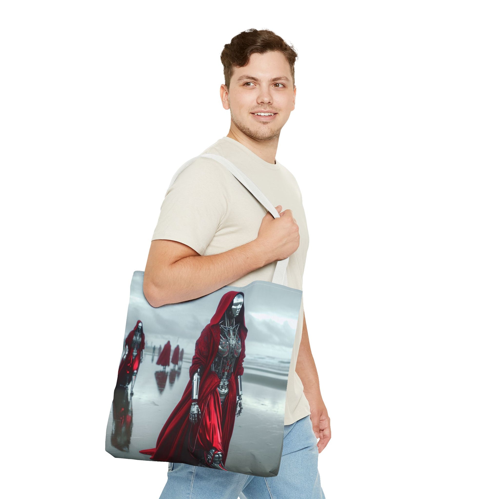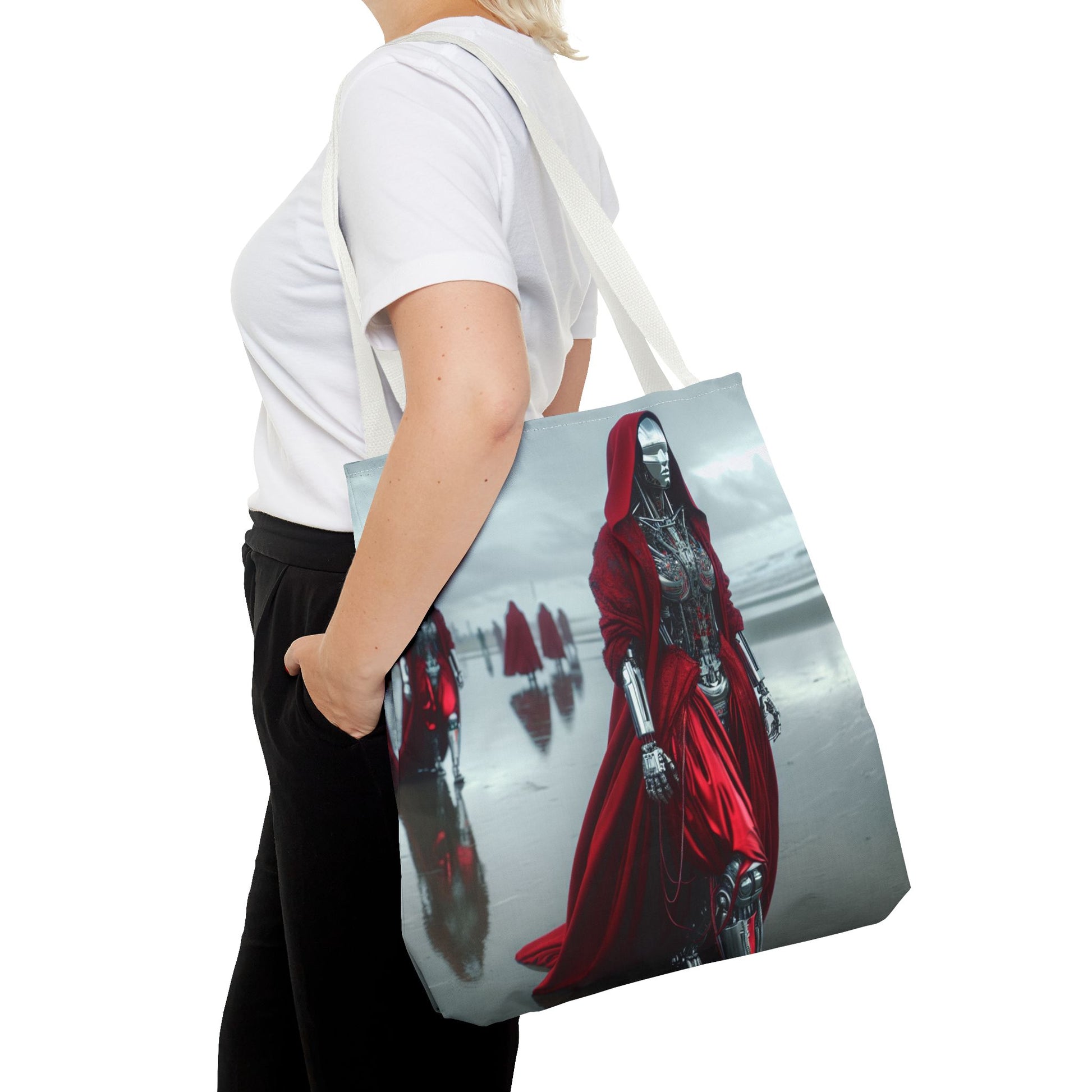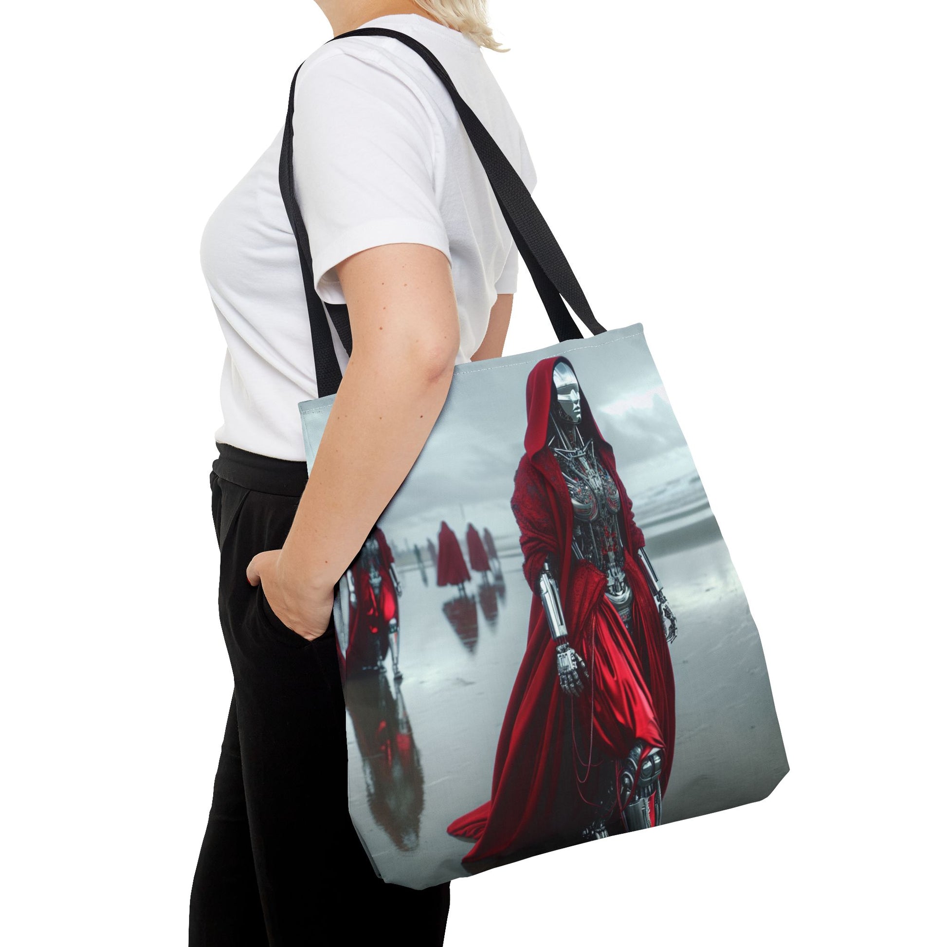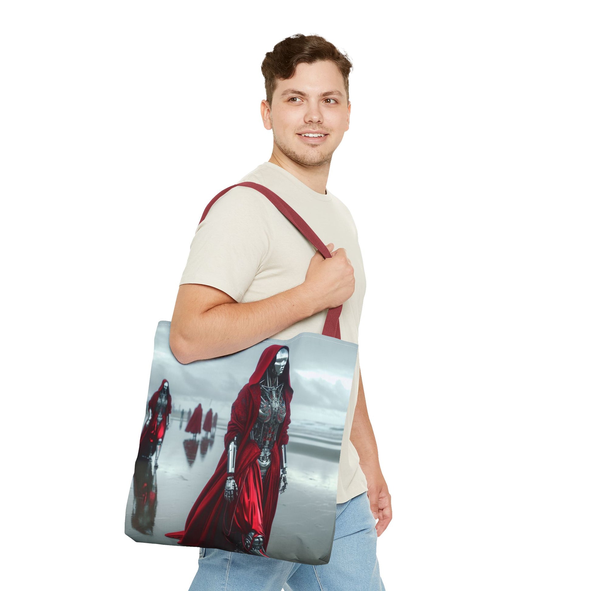 Futuristic Red Hooded Tote Bag, Eco-Friendly Shopping Tote, Stylish Reusable Bag, Perfect for Gifts, Fashion Statement